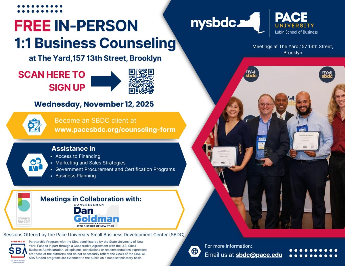 Meet one to one with a business advisor from the Pace Small Business Development Center Brooklyn. Wednesday November 12th - one hour slots available throughout the day. Book you spot here or reach out to [...]